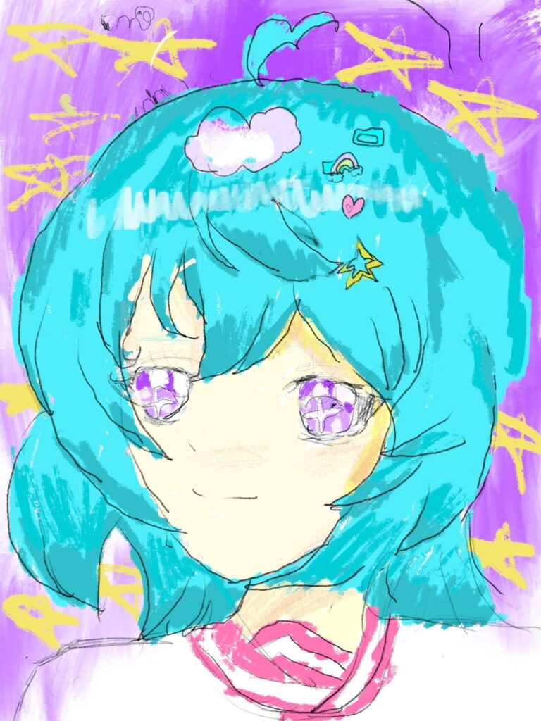 She stood at the edge of a pastel dream, where the sky melted into sherbet hues—pink, mint, lemon, and lavender—like memories too soft to hold. Her twin tails shimmered in icy blue, echoing a quiet resilience, while the single visible eye, deep and cerulean, held a gaze that had seen both wonder and weight.